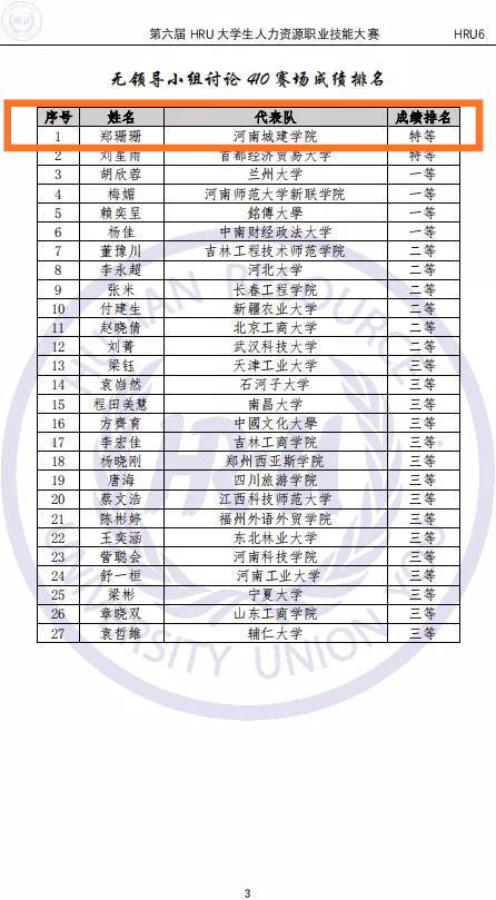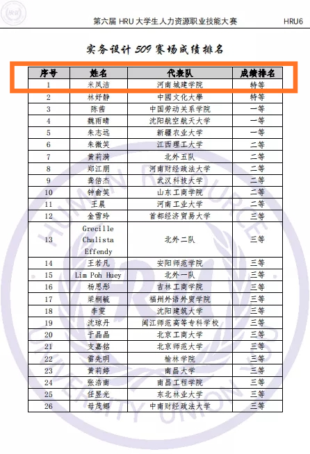 (通讯员 常小高)11月21日至22日,由中国劳动关系学院组织的第六届中国大学生人力资源职业技能(HRU)大赛暨海峡两岸人力资源职业技能大赛全国总决赛成功举办。由我校胡举华、朱志培两位老师带领,郑珊珊、米凤洁、赵奕星、李艺伟、张永冠5名学生组成的威廉官网中国官方网站代表队在总决赛中荣获国家团体一等奖和两项个人特等奖。