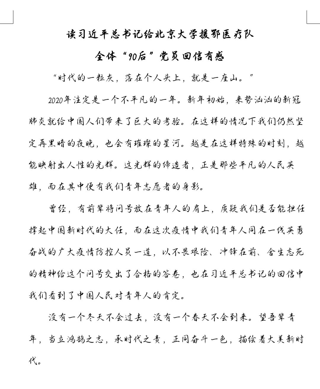 凝聚青春正能量,众志成城抗疫情。疫情是一场保卫战、阻击战、歼灭战,更是一场全民战。普通百姓自发捐款,医护人员涌向“前线”。援鄂医疗队的挺身而出、担当奉献,充分展示了新时代中国青年的精神风貌。作为青年学生的我们,亦肩负着祖国更加繁荣昌盛的未来,我们要像习近平总书记所言,励志成为有理想、有本领、有担当的青年一代,不惧风雨、勇挑重担,让青春在党和人民最需要的地方绽放绚丽之花。
