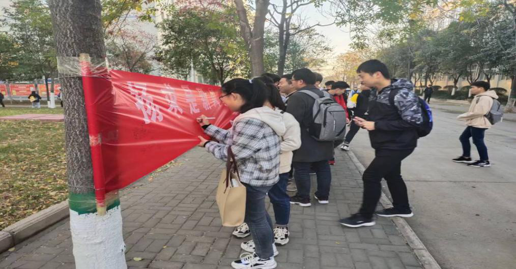 (通讯员:王杰 高格格)为营造良好学习氛围,全面提高学生自主学习的积极性和主动性,养成良好的学习习惯,以奋发有为、开拓进取的精神投入到学习生活中,以昂扬向上的优良学风迎接本科教学审核评估,我院于11月14日在学院门前组织学生在“建设良好学风,不负韶华时光”以及“扬求是新风,树学风新貌”的横幅标语上签上自己的姓名,作为对自己的激励。
