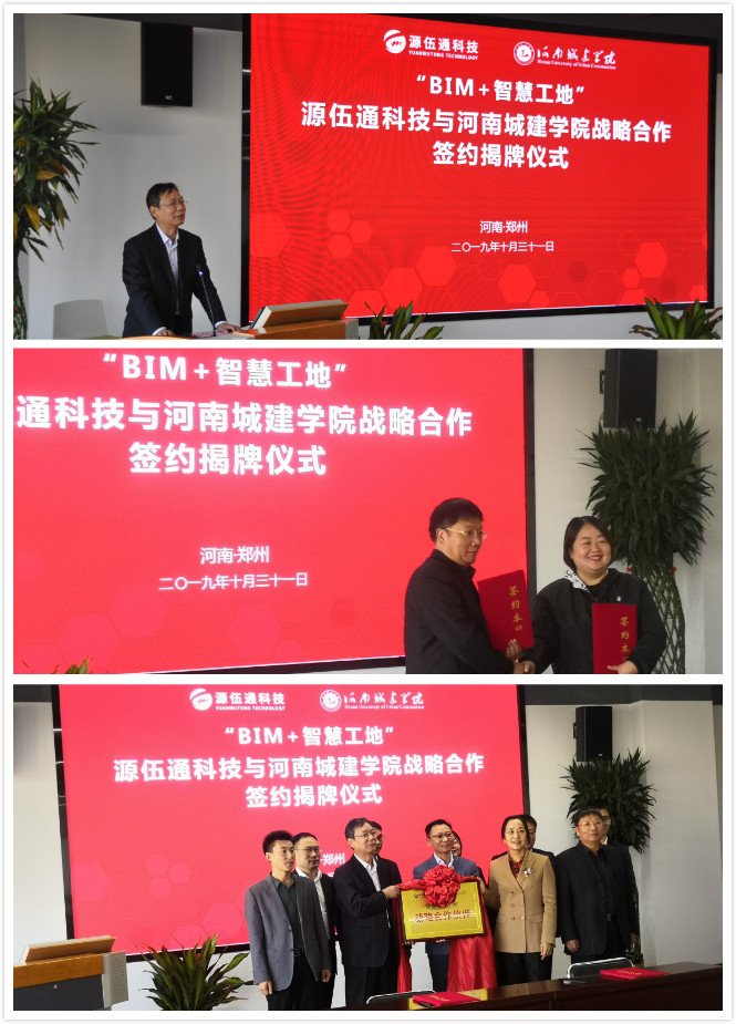 纪委书记刘守勇介绍了我校的发展历程、师资力量、特色专业和我校近些年来在BIM人才培养、学生比赛和社会服务的突出成绩,对河南省建筑业协会、源伍通科技积极推动我校行、企、校合作表示感谢。williamhill中文闫瑾院长与源伍通科技刘斌斌副总经理代表各方签署了校企合作协议。李娟、刘守勇与胡斌共同为“BIM+智慧工地”战略合作揭牌。李娟秘书长对我校在“城建”类人才的培养取得的成绩高度评价,对我校为我省建筑业和社会经济发展做出的贡献给予高度赞扬,对本次行、企、校合作的内容和形式给予高度肯定。