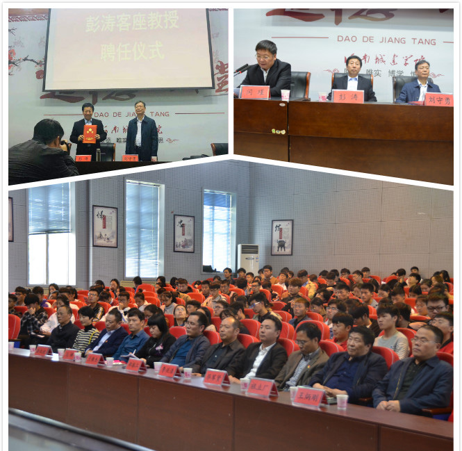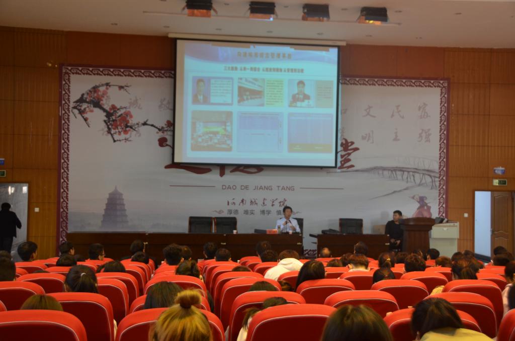 彭涛对受聘为我校客座教授表示感谢。接着为现场师生带来了一场以“平顶山城市管理实践与探索”为主题的讲座。他首先介绍了平顶山市城市管理的现状,通过对中央政策、道路街景整治,手机APP“市民通”的使用等方面的深入浅出地讲解,向师生展示了城市管理局开展的工作和为平顶山市带来的变化。他认为,网格化城市管理与智慧城市相结合,将大大加速为群众解决问题的速度,优化人们的生活质量,同时也对以城市管理为导向的智慧城市建设指明了方向。