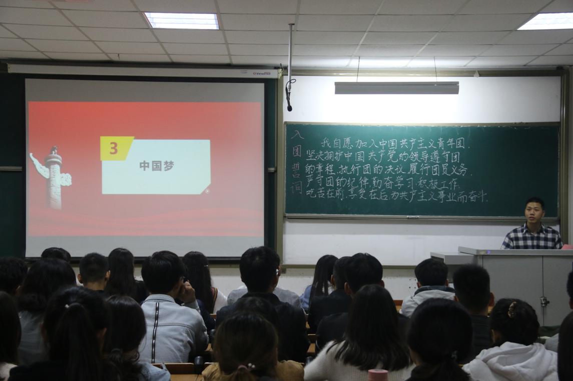 在随后的团课上,2017级学生崔宏将作为代表从四个方面为大家生动讲述主题微团课,他提到:“青春心向党,争做接班人。作为新时代的青年团员一定要清晰地明白新时代中华人民共和国、中国人民、中国共产党以及中国梦背后的深刻内涵。争取成为一名对社会有益,对人民有益,对国家有益,能够在新时代有担当,敢啃硬骨头的优秀社会主义接班人。”
