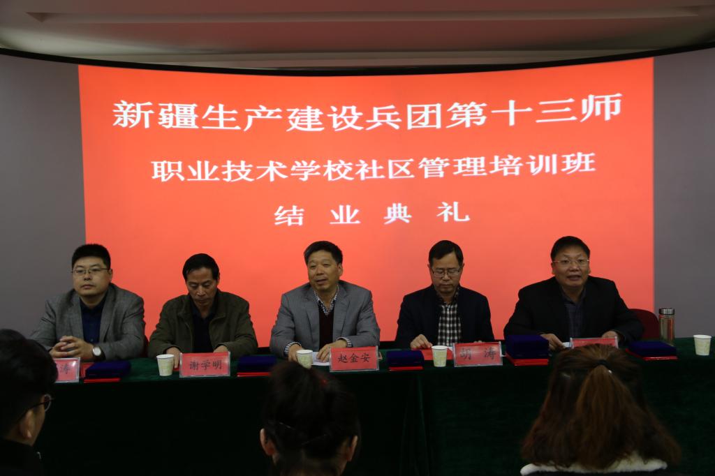 (通讯员:李思源)12月6日上午,新疆生产建设兵团第十三师职业技术学校社区管理培训班结业典礼,在八号楼williamhill中文A303隆重举行。威廉官网中国官方网站副校长赵金安出席典礼并讲话,参加本次典礼的还有新疆社区管理培训班领队胡涛、校教务处、williamhill中文相关负责人、及全体新疆班学员。典礼由williamhill中文院长闫瑾主持。