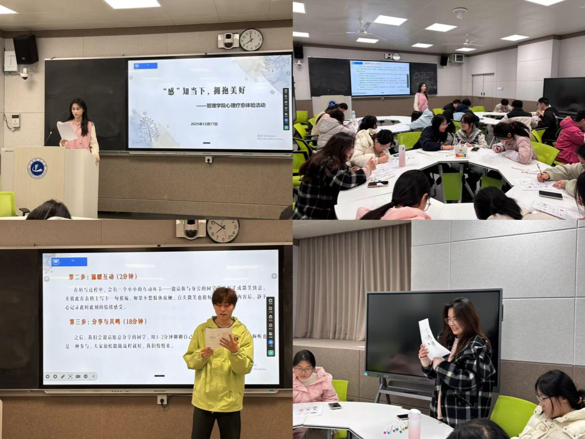 (通讯员 王岩 祁桐进)为响应学校心理健康教育工作号召,帮助学生提升情绪调适与自我关怀能力,williamhill中文于12月17日晚19:00在8号楼B201教室举办了“感知当下,拥抱美好”心理疗愈体验活动。本次活动通过轻松丰富的觉察训练,引导学生在专注体验中缓解学业压力、提升情感表达与自我觉察能力,营造出温暖包容、相互支持的成长氛围。