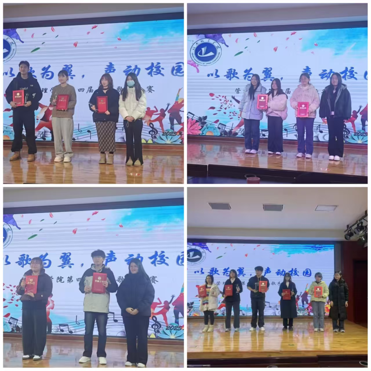 来自不同年级的十二位选手用各具特色的嗓音,唱响心声。他们或以质朴深情的民谣浅吟低唱,娓娓道来;或以时尚动感的流行乐曲点燃全场,节奏飞扬;亦不乏默契搭档的和谐合唱,声部交织间尽显配合之妙。舞台背景的大屏画面则与歌声情绪精密呼应,为每段表演赋予了独特的视觉叙事与沉浸氛围,极大提升了演出的感染力与艺术层次。评委们认真考量每一首歌曲的呈现,从音准、情感、舞台表现等维度细致打分。现场观众的掌声与欢呼声此起彼伏,将比赛的热烈氛围一次次推向高潮。比赛最终评选出十佳歌手。