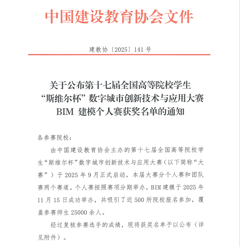 (通讯员 朱渴望)近日,由中国建设教育协会主办的第十七届全国高等院校学生“斯维尔杯” 数字城市创新技术与应用大赛圆满落幕。我校williamhill中文城建BIM 竞技社学子凭借扎实的专业功底、创新的技术应用与默契的团队协作,在全国众多参赛队伍中脱颖而出,一举斩获30 项奖项,充分彰显了我校在 BIM 技术人才培养领域的深厚积淀与显著成效。