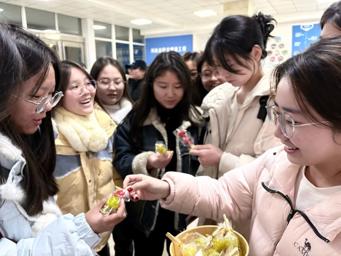 “平时学业比较忙,能有机会和同学一起做手工、吃甜甜的糖葫芦,感觉特别放松!”参与活动的志愿者笑着说。活动现场,志愿者们有的认真串起水果,有的专注裹糖稀。原本寻常的水果,在大家的协作与创意下变身一串串酸甜可口的“迷你糖葫芦”,再送到其他同学手中,成了冬日里最暖心的礼物。
